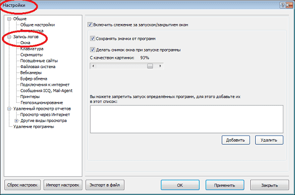 Запускаем программу – Настройки – Запись логов – Окна – включить слежение за запуском/закрытием окон. По вашему желанию можно установить галочку на «Сохранять значки от программ» и «Делать снимки окна при запуске программы».
